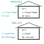 Här måste man skilja mellan absolut och relativ luftfuktighet. Absolut luftfuktighet kallas även för ånghalt. Beteckningar och enheter är v, g/m3, respektive RF, %. Mättnadsånghalten (som finns i tabellen) motsvarar den maximalt möjliga ånghalten vid olika lufttemperatur. Fukttillskottet (2 g/m3 i exemplet) är ånghalten för inneluften minus ånghalten för uteluften. Den relativa luftfuktigheten anger hur mycket vattenånga luften innehåller som andel (eller procentuellt) i förhållande till … [Läs mer...] om … och svarar 4/25