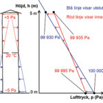 Här visas svaren först, och alla förklaringar efteråt. a) Figuren till höger visar hur lufttrycket fördelar sig för inne– och uteluft. För den kallare och tyngre uteluften gäller att lufttrycket ökar nedåt med 14 Pa för varje m, och för den varmare och lättare inneluften är motsvarande ökning bara 12 Pa per m. Lufttrycken visas därför med två linjer med olika lutning, där lutningarna motsvarar de här olika tryckgradienterna. Luft läcker alltid från högre till lägre lufttryck, vilket visas … [Läs mer...] om … och svarar 1/26